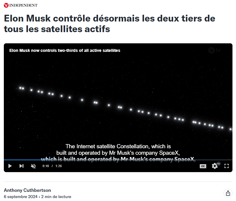 En 2025, un homme seul contrôle 2/3 des satellites actifs. Est-ce que le terrien moyen comprend bien les significations de ce constat? A l’heure actuelle, un homme aurait accès, à titre personnel, au ciel international pour y placer les satellites de son choix pour nous surveiller, et collecter nos données. En échange, il nous met à disposition le réseau Internet. Que Elon Musk soit un homme de paille (ce qu’il est selon toute vraisemblance) ou pas n’est pas le sujet, la réalité est que des privés sont en charge de nos vies, dans le plus petit détail de notre intimité.