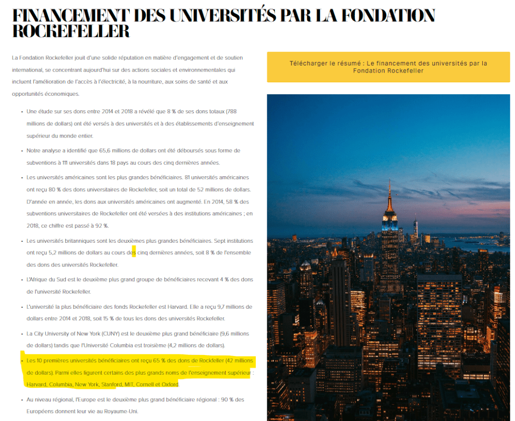 Dans notre cas, nous retiendrons que Harvard et Stanford reçoivent de très grandes sommes de la fondation Rockefeller, mais aussi de celle des Gates et de bien d’autres business philanthropes. Ces 2 centres vont jouer un rôle central dans la thématique du Développement durable, ainsi que pour trouver des remèdes à la chose. Nous trouvons ainsi le développement de la géo-ingénierie, le développement de l’IA, l’ingénierie agricole, etc.