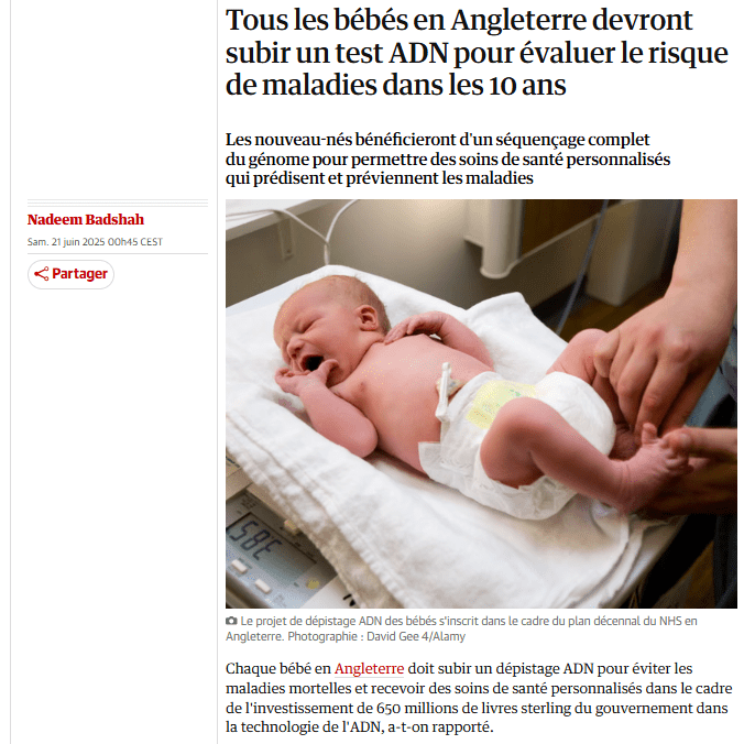 Cela peut être choquant, mais n’est certainement pas impossible. Voici une information de première importance, peu relayée par les médias. Elle fait partie du pack mis en place par le premier ministre britannique. Il y est question de carte d’identité numérique émise pour chaque nouveau-né, mais pas seulement. Le séquençage du génome des bébés fait partie du programme de santé supposé prédire l’avenir… Et tant pis pour les marges d’erreur, et autres cyberattaques… https://www.dailymail.co.uk/health/article-10212467/DNA-data-healthy-babies-hacked-sold-Governments-future-ethics-expert-says.html