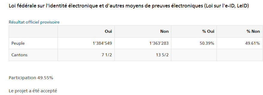 La carte d’identité numérique a une longue histoire en Suisse. Le Conseil fédéral essaie de la refiler depuis de nombreuses années. Et les « bénéfices » n’étaient pas bien saisis par la population qui n’en voulait pas. La loi y relative, Loi sur l’identité électronique (e-ID), avait été refusée une première fois en mars 2021. Le peuple avait voté massivement contre (64% de non) principalement à cause de la crainte que des entreprises privées gèrent les données personnelles.