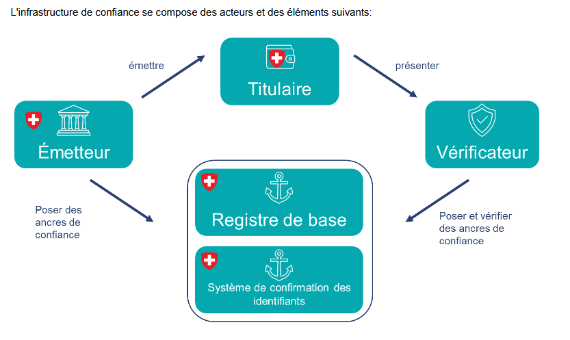 La Confédération met en place un mécanisme étatique permettant de vérifier si un identifiant et une clé cryptographiques appartient à un émetteur inscrit dans le registre de base ou un vérificateur intéressé. Il constitue le deuxième volet de l’ancre de confiance du système : il permet aux titulaires et aux vérificateurs de savoir à qui ils ont effectivement à faire (Art.18 al.1). Pourtant confiance ou pas, le texte reconnait que « Certes, il existe un risque que des émetteurs ou des vérificateurs puissent délivrer des preuves électroniques en usurpant leur identité. Art.17al.3»